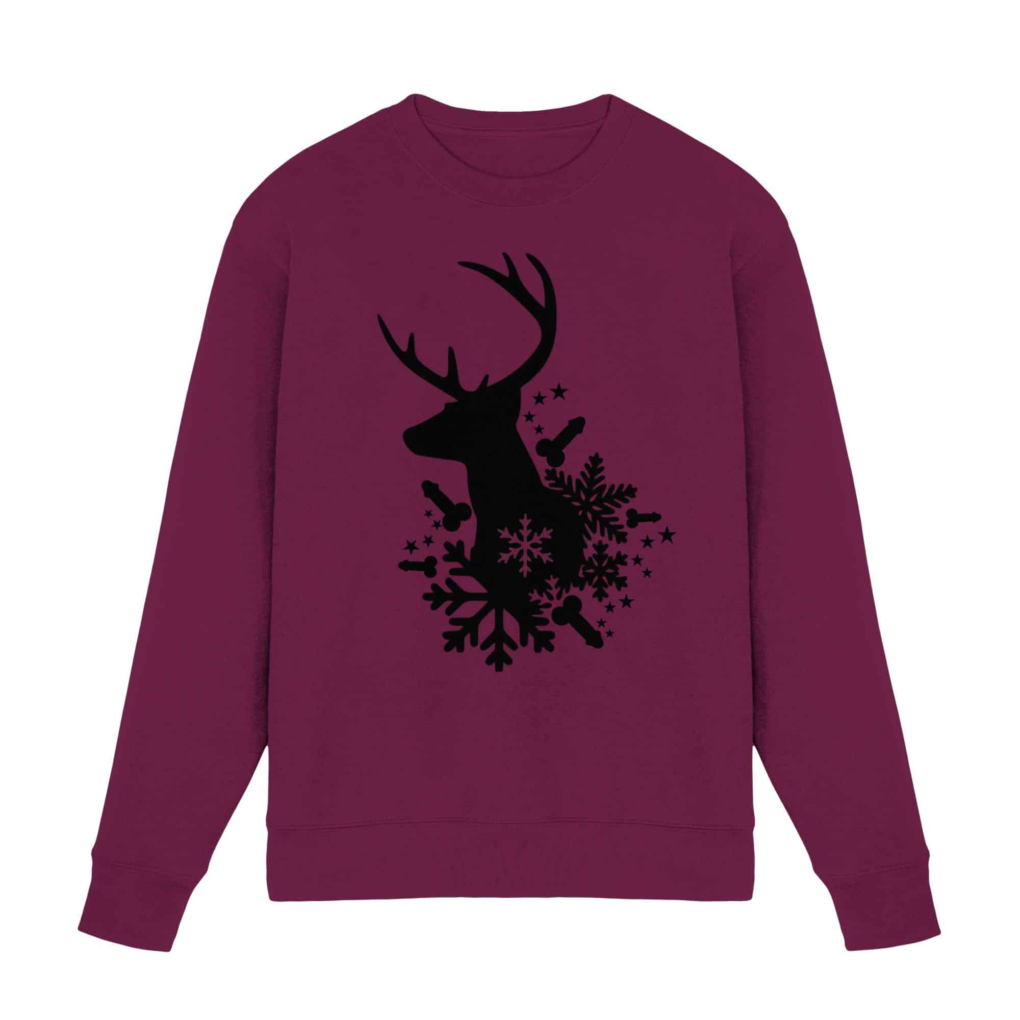 Das Sweatshirt besticht durch ein filigranes Hirschmotiv, umgeben von zarten Schneeflocken und einer Anmut von Naturmotiven. Der schwarze Hintergrund hebt die Details hervor und verleiht dem Design eine elegante Note.