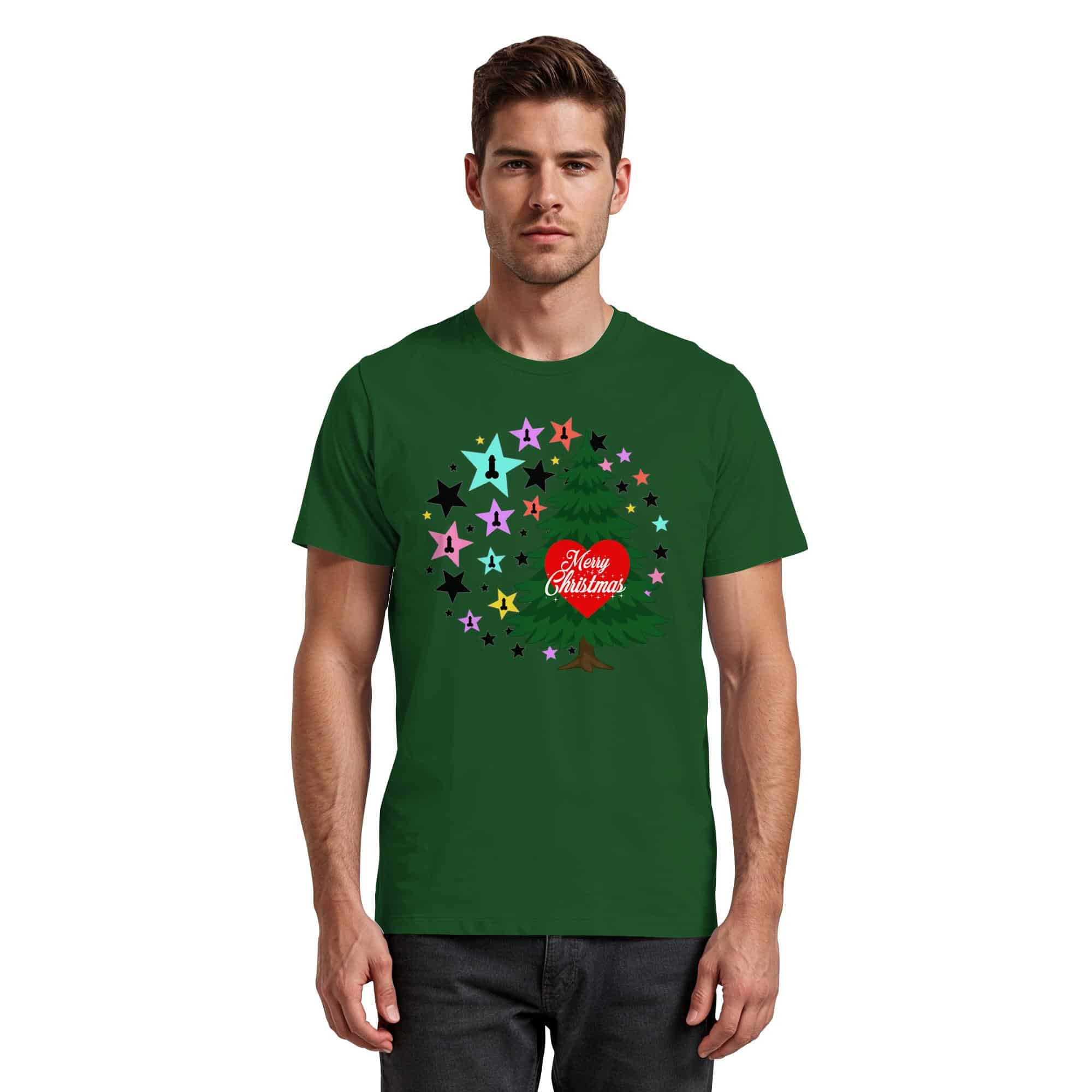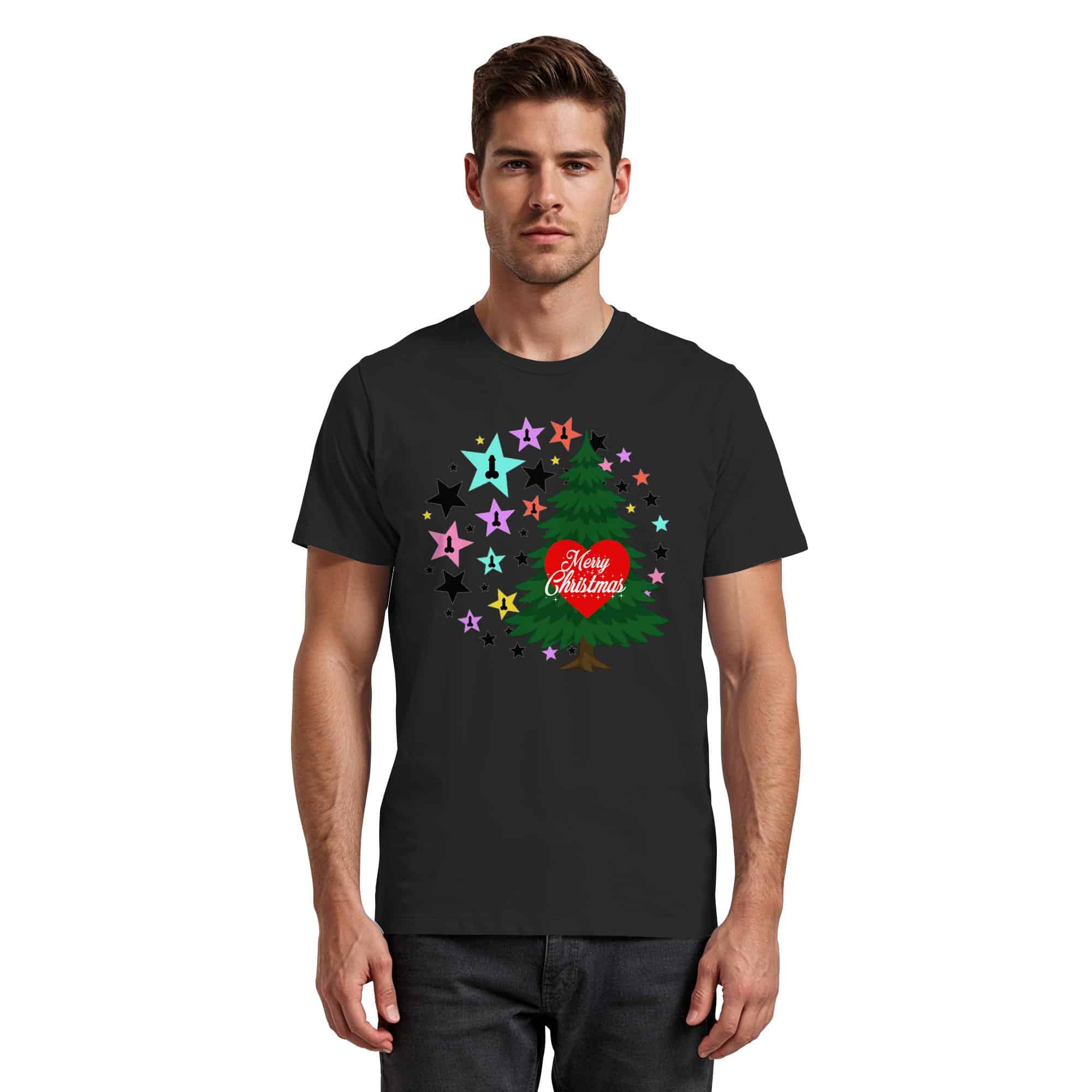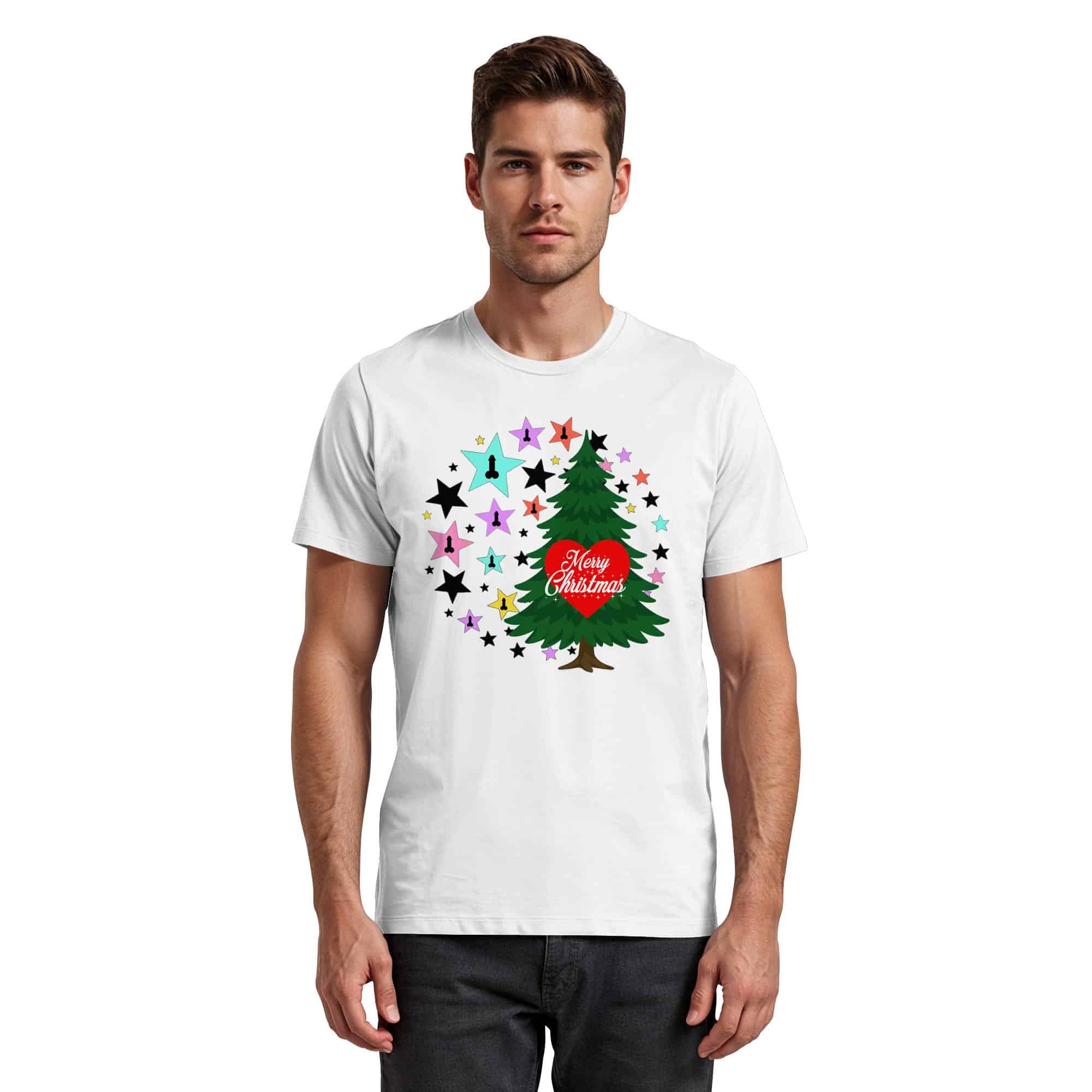 Das T-Shirt zeigt ein fröhliches Weihnachtsbaum-Motiv, umgeben von bunten Sternen. Die auffälligen Farben und kreativen Motive schaffen eine festliche Atmosphäre.