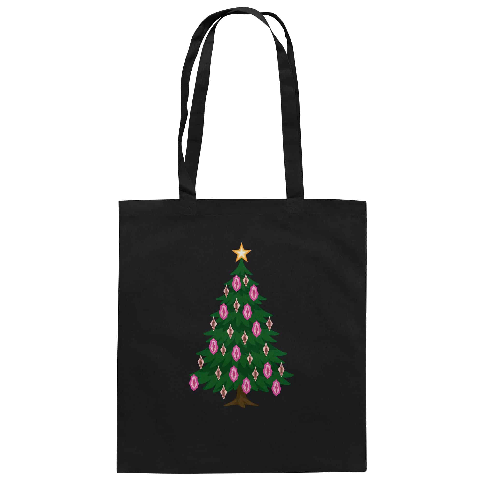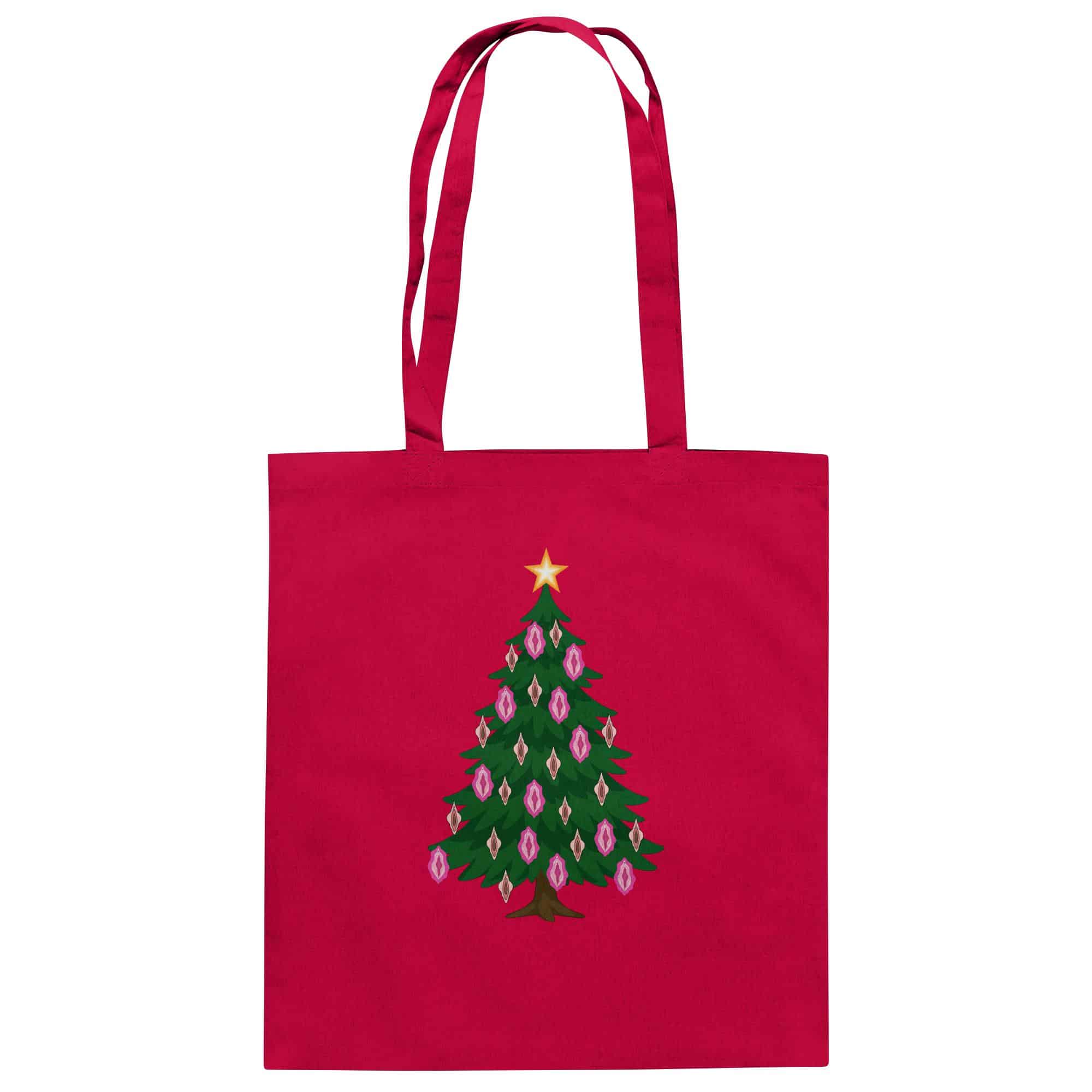 Die Tasche zeigt einen kunstvoll gestalteten Weihnachtsbaum mit zarten rosa und braunen Ornamenten. Die dekorativen Motive schaffen eine warme, einladende Atmosphäre.